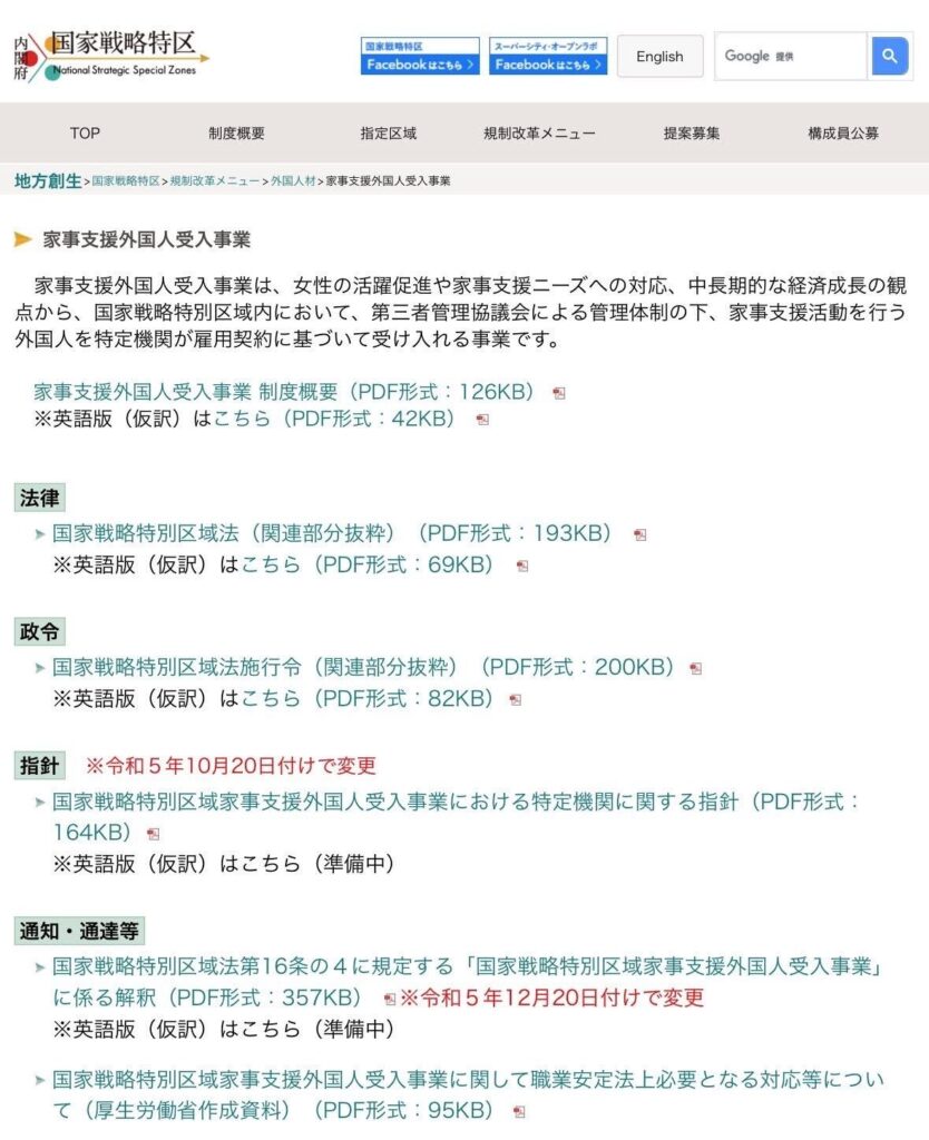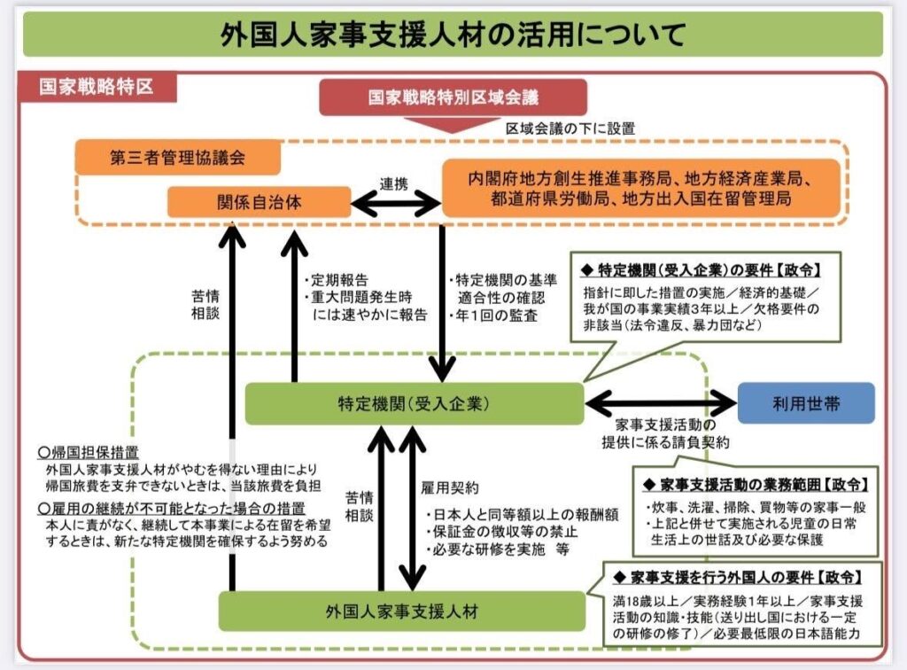 「家事支援外国人受入事業」は、国家戦略特別区域において「女性の社会進出支援と家事労働市場の拡大を図る」という趣旨のもと、2016年に安倍政権下で法改正、制度化された経緯があるようです。
