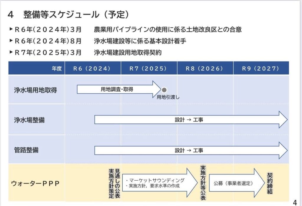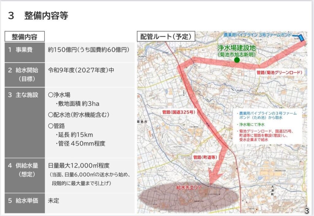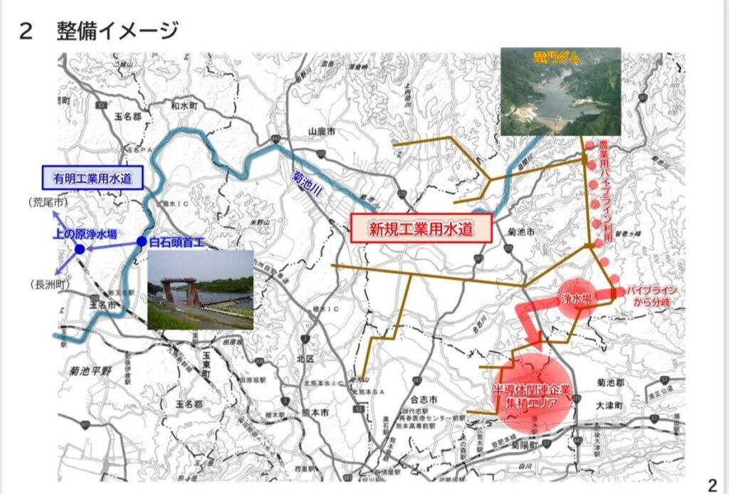県は今後、竜門ダムに貯留する有明工業用水の未利用水(400万トン/年)を半導体工場集積地まで、パイプラインで送るための工事を行う予定だが、工期が2年遅延し、また事業費が150億円→200億円に上がっている。