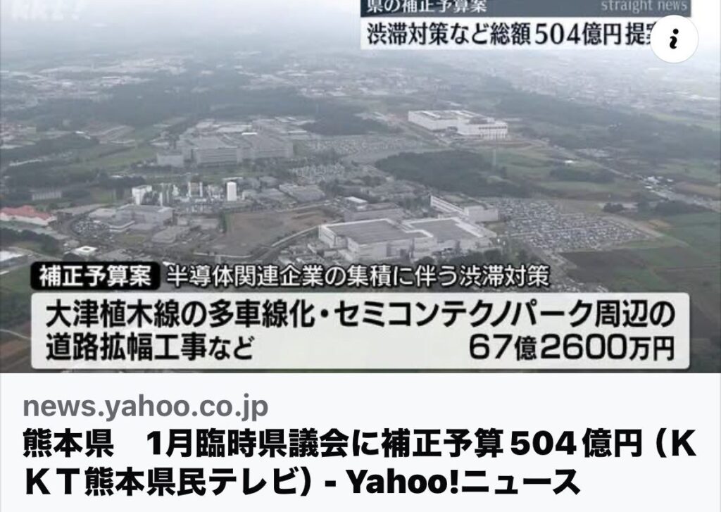 ⚫︎半導体関連企業の集積に伴う渋滞対策として、現在進めている大津-植木線の多車線化、セミコンテクノパーク周辺の道路拡幅工事などに67億2600万円